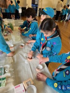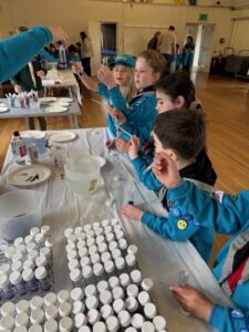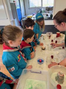 Beavers enjoyed a morning completing 10 different experiments at District Beaver Science Day.  They made volcanoes and tested for acidity & alkalinity.  They made stomp rockets & investigated water tension, as well as old favourites completing electrical circuits, magnetism and stomp rockets.  All Beavers taking part achieved their Experiment badge!