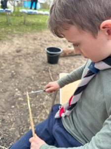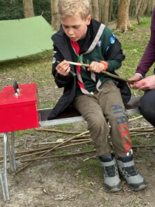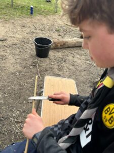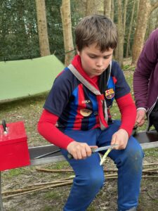I really enjoyed Cub camp because I liked the cheeseburgers and making mince parcels by wrapping mince and vegetables in tinfoil and putting them on the embers of the fire. We went into the forest to collect Hazel sticks and whittled them into points to put bacon on and dampers. We did tracking and learning about first aid. We had lots of free time to play in the woods. Some Cubs played log rugby, which I enjoyed watching. The weather was good and it didn’t rain at all.