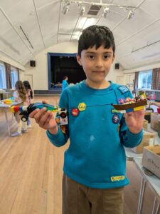 What a creative bunch of Beavers we have at 1st Knaphill! Beavers enjoyed a fantastic sleepover focused on Lego challenges, both individual and as a team. They all achieved their Builder badge as part of the event. They completed a series of Lego ‘mini challenges’ and then had a team challenge to make a Lego marble run. Their creative imagination was fantastic. Beavers then made their own delicious pizzas for dinner, choosing their own toppings followed by jelly & ice cream for desert. The evening finished with fires outside where they made s’mores to enjoy with their hot chocolate.